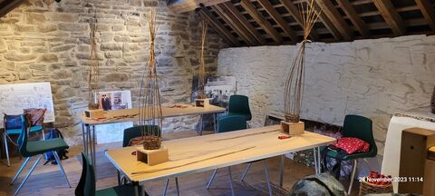 Willow Weaving Workshop, two tables with items weaved from willow on them.