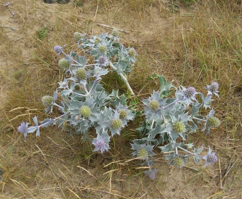 The rounded, blue flower heads of Sea-holly make it look a bit like a thistle when it is in bloom. It has silvery-blue leaves with many prickly spikes on their edges.